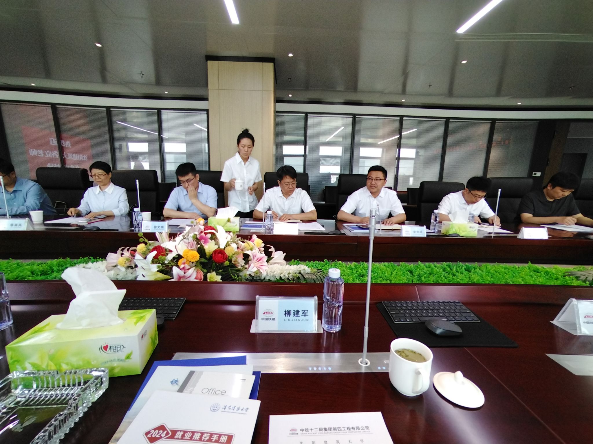 柳建军书记介绍了学院各专业实习生和毕业生的情况,针对企业对实习生和毕业生知识、能力和素质等方面的要求做了全方位的了解。中铁十二局各分公司代表介绍了公司的主营业务范围和目前工程情况等。双方就青年人才培养、毕业生就业、校企合作等事项开展了深入交流,提出要传承红色基因、发扬光荣传统,着力在科技创新合作、人才联合培养、实习就业等方面深化合作,为国家基础设施建设添砖加瓦。活动现场聘请中铁十二局四公司纪委书记王俊武为兼职就业导师,促进校企双方的互利共赢。